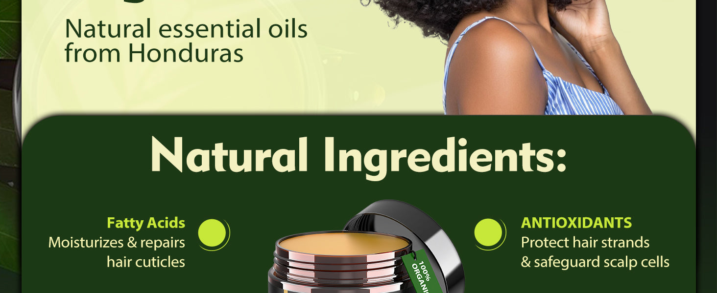 🌿 Natural Batana Oil: 100% raw and unrefined, rich in Omega-9 and Vitamin E to nourish the scalp and hair follicles.